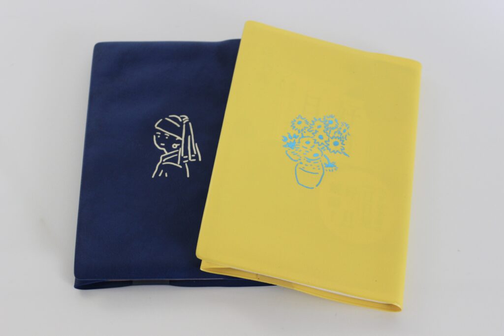 ゴッホのひまわりとフェルメールの真珠の意味飾りの少女がモチーフになったイラストが入ったブックカバー。