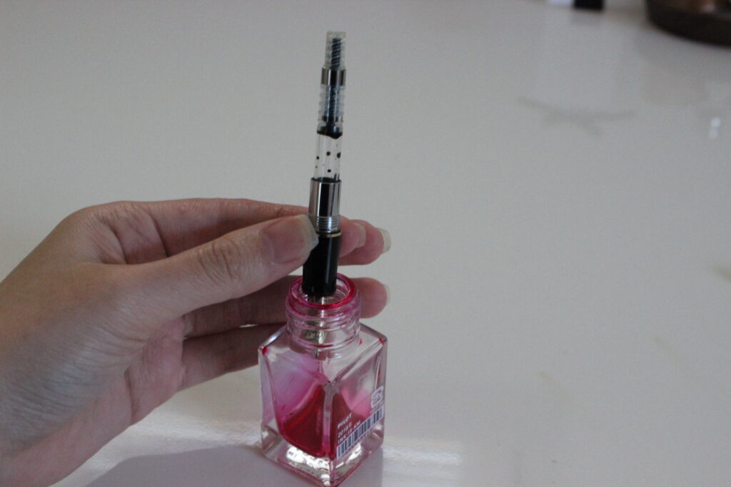 ただ、手入れもそこまで難しくなく、ペン先を先程の写真のように水に浸してくるくると回し、戻す。